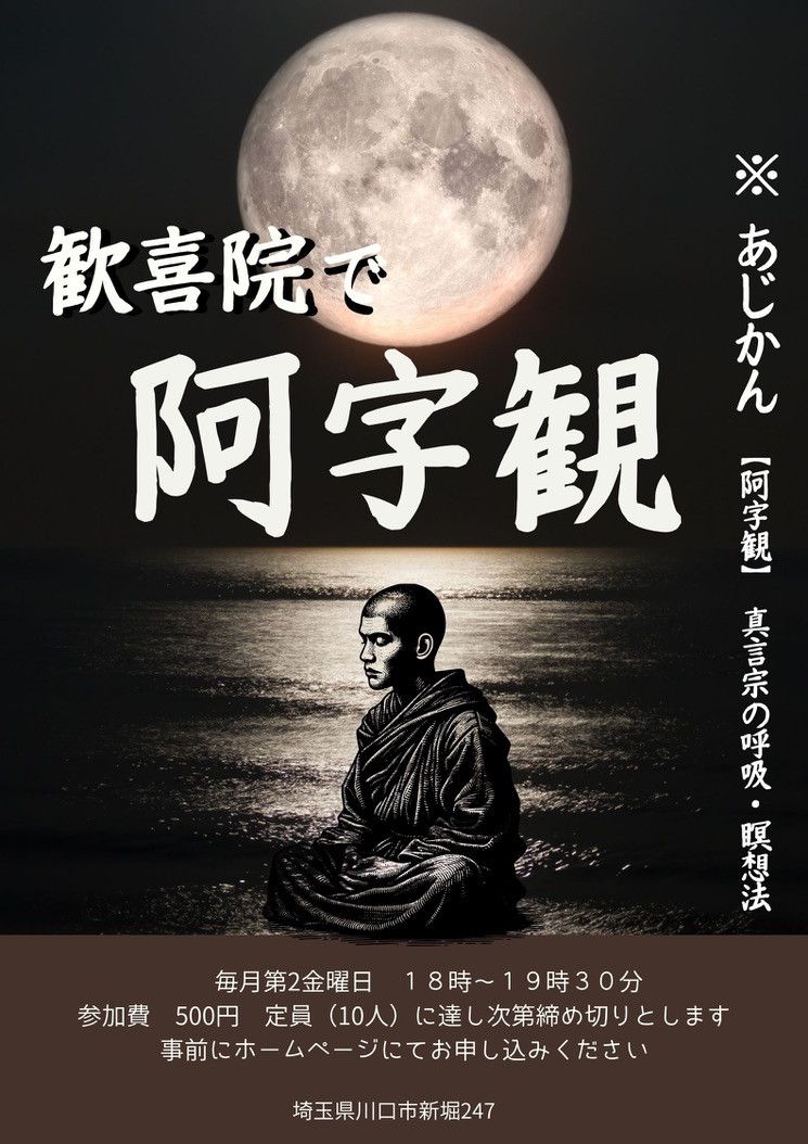 真言宗の呼吸瞑想法「阿字観」の体験ができます 瞑想に入る前に軽い体操をしてから体験していただきます 動きやすい格好でお越しください 開催時刻 18:00〜19:30 参加費 500円 定員 10名